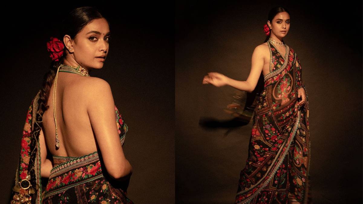 Keerthy Suresh’s floral print multi-coloured sari is a perfect example of how traditional attire can be infused with modern elements to create a stunning and unique look. The vibrant colors, intricate floral patterns